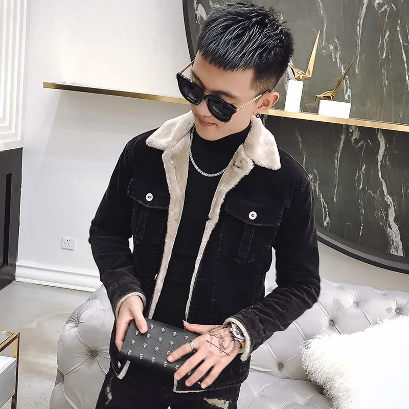 .Gallery of Luxury 2018 Winter Mens velvet Cotton slim Denim Jacket Male Thick Warm Lined Fleece Jeans Jackets black slim jeans coat Top 3xl